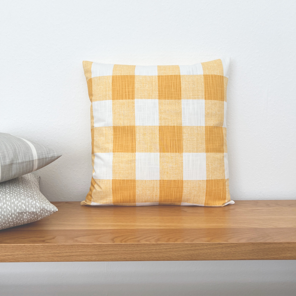 Die Kissenhülle Anderson in goldgelb ist mit einem klassischen Karo-Muster versehen. Ob in Kombination mit anderen Designs und Farben oder einfarbigen Kissen, das karierte Kissen ist immer ein Blickfang. Die Kissenbezüge sind in vielen verschiedenen Größen wie 40x40, 50x50, 60x60, 30x50 und 40x60 erhältlich. Kissen in großem XXL Format sind wunderbar als Boden- oder Sitzkissen nutzbar. Auch als Ablagefläche für ein Buch oder Tablet sind sie gut nutzbar.