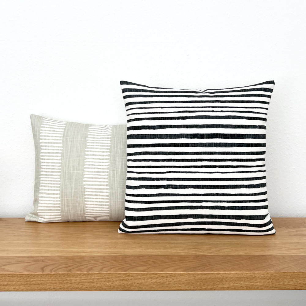 Hochwertige Kissenhülle in schwarz mit weißen Streifen. Schön in der Kombination mit den Kissen Dashe und Waves. Die Kissenhülle ist ebenfalls in den Größen 40x40, 50x50 und 60x60 erhältlich. Es handelt sich um 1 Kissenhülle, um das vordere gestreifte Kissen.